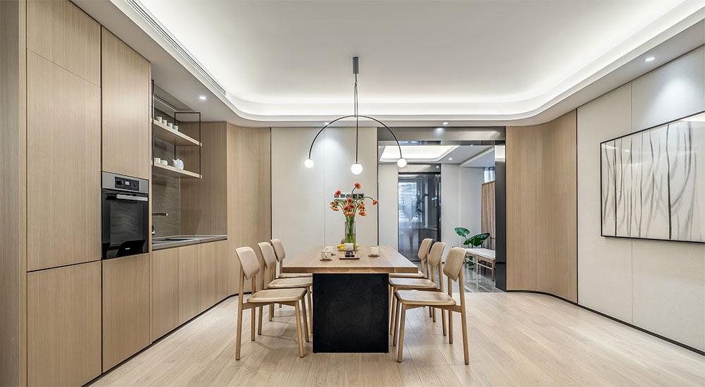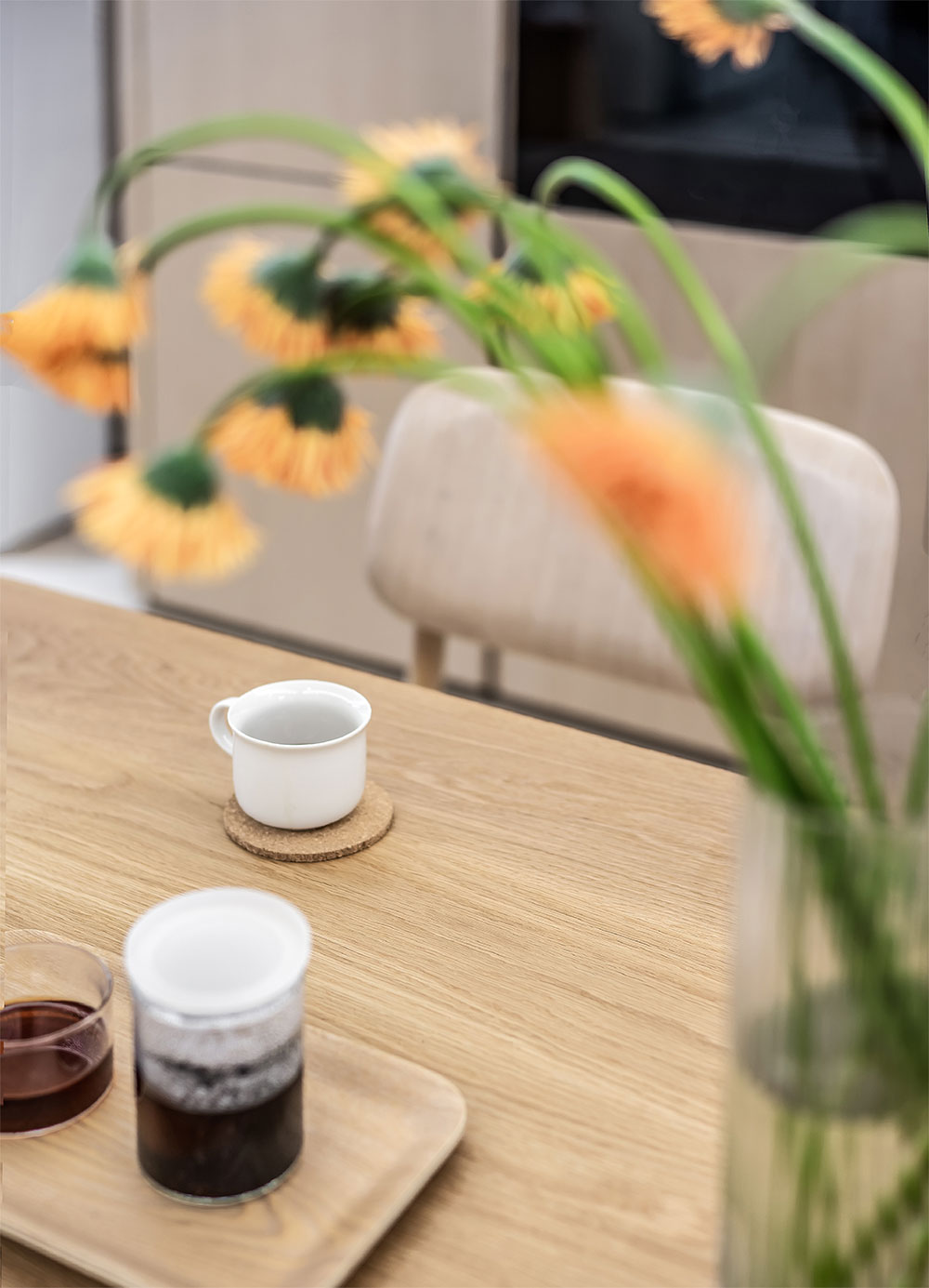六人位長(zhǎng)形餐桌延續(xù)就餐的儀式感,白瓷茶盞,玻璃花器,明麗的非洲菊,凝匯成金色的希望,與流淌的木色融為一體,在交談的話語中慢慢升溫,遠(yuǎn)離都市的嘈雜,交織成靜謐清閑的幸福感。
