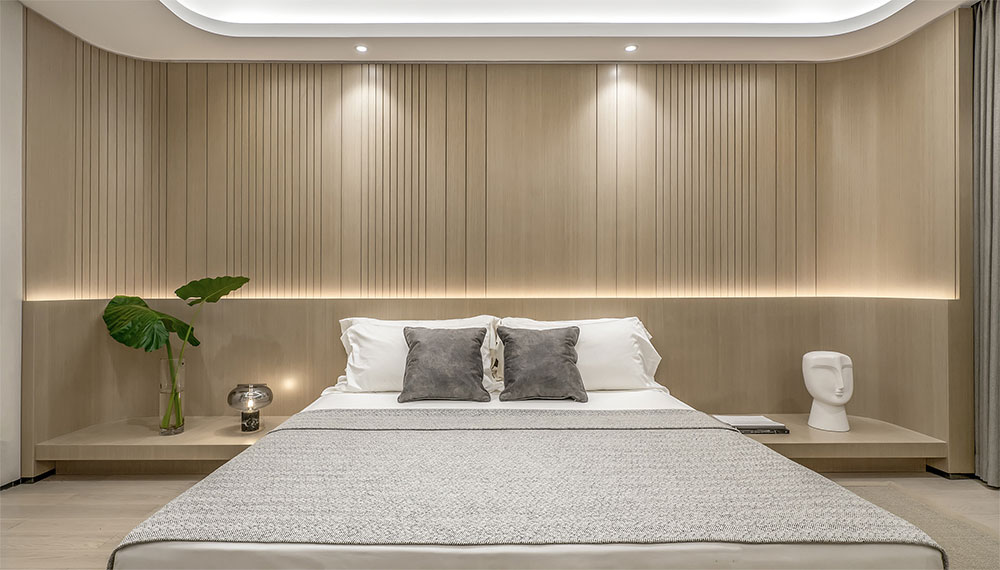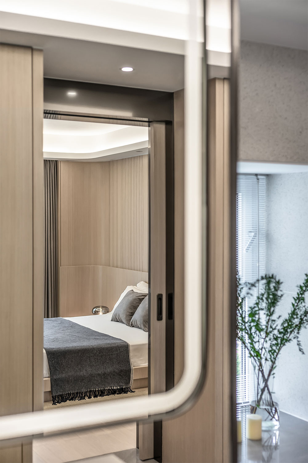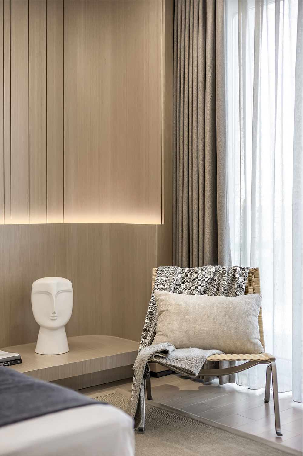 主臥延續(xù)客廳木飾面所營(yíng)造的圍合性,溫暖如冬日的陽光。一體化床箱給予睡眠更多的安心感,棉質(zhì)鋪就的灰色床品使人仿佛沉浸在白棉簇?fù)淼膽驯е校挥X睡意漸濃。點(diǎn)點(diǎn)燈輝如星河萬千,時(shí)間被靜止,舒服又愜意。