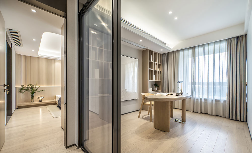 書房的掛畫是水波紋的剪紙畫,如同泉水叮咚流淌,光影、虛實(shí),有著大自然的輕靈、曼麗和灑脫。書桌模擬了水滴的形態(tài),流露出一種無聲而流動(dòng)的美。在這里可以安靜地看書、寫字,周邊似有水流圍繞潤(rùn)物無聲,鋪敘儒雅的魅力,一切都顯得純粹、詩意。