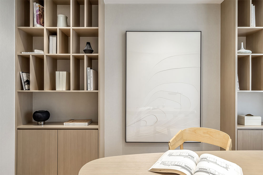 書櫥的設(shè)計(jì)著重細(xì)節(jié),設(shè)計(jì)師鄭鴻始終將本次的設(shè)計(jì)重心定位于:輕松、自在的居住感。大小合適的間距讓書籍的收納更加方便,整體的造型也類似格柵的形狀,參差錯(cuò)落,盡顯實(shí)用美學(xué)。