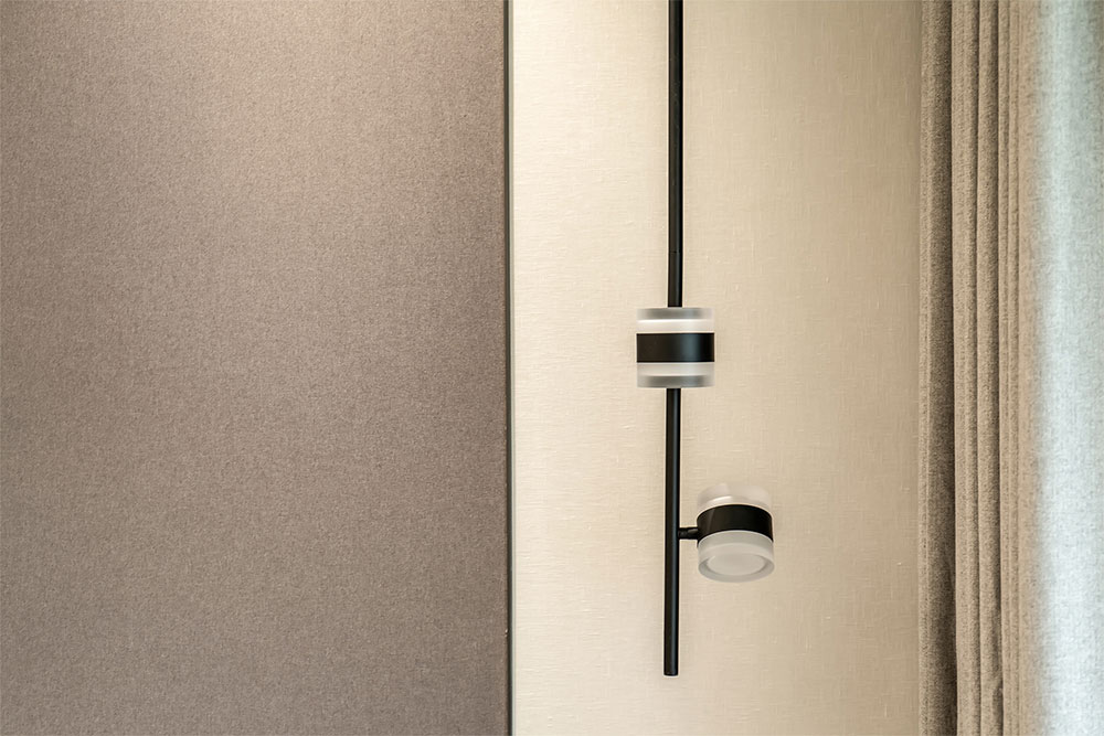 次臥清爽利落的黑白灰處理,讓空間透露清凈的起居哲學(xué)?;疑尘皦εc床品仿若一體,立體而吸引目光。狀似管弦樂器的吊燈將藝術(shù)的氣息悄然點(diǎn)亮,積極的生活哲學(xué)告訴我們:只有內(nèi)心輕盈,才能擁抱更多的希望。