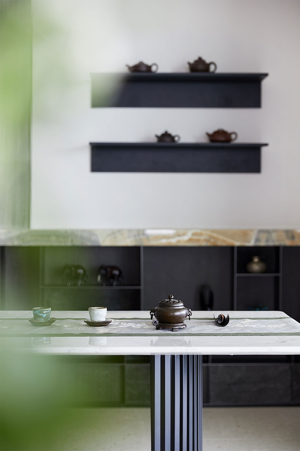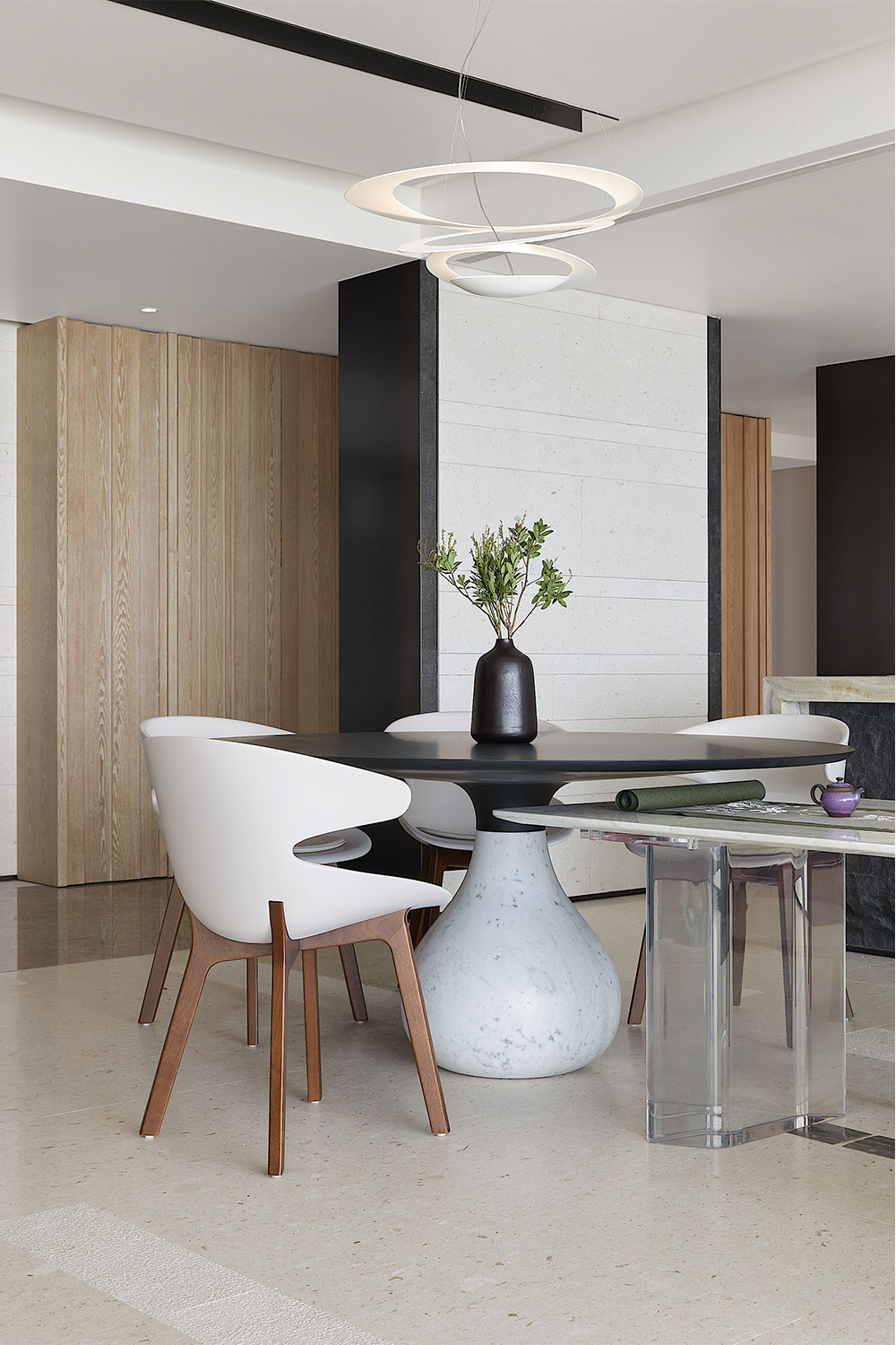 餐桌的設(shè)置融入了創(chuàng)意的理念:造型別奇的六人圓桌是日常就餐區(qū)域,清雅的輕質(zhì)茶桌可獨(dú)立于一旁,亦可與圓桌合并。嘆清茶,食佳肴,飲醇酒……家人好友相聚于此,在四時(shí)三餐中增強(qiáng)彼此間的情感鏈接。
