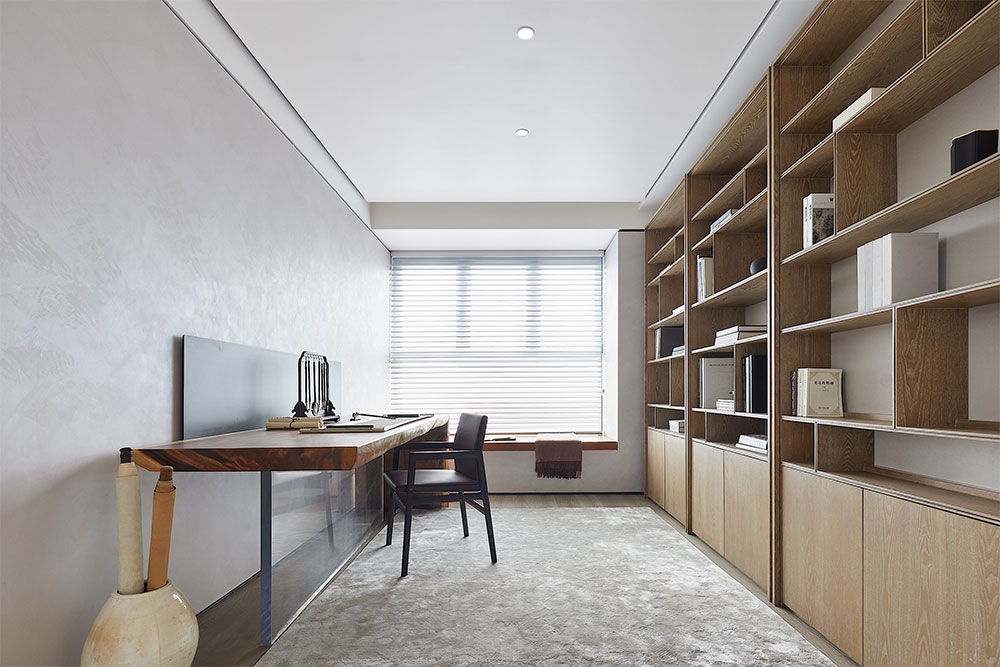書房空間以新中式美學(xué)意涵作為空間基調(diào),營(yíng)造“閣清書靜”般的閑適光景。定制的木質(zhì)書桌形制精美樸雅,亞克力與實(shí)木鑲嵌,保留木的肌理感,令空間氣韻更為靜謐,打動(dòng)人心。