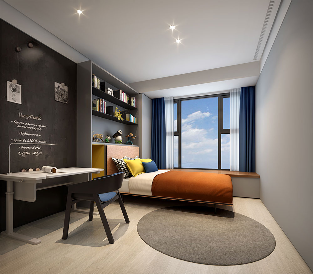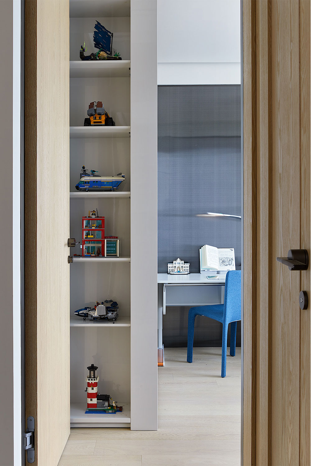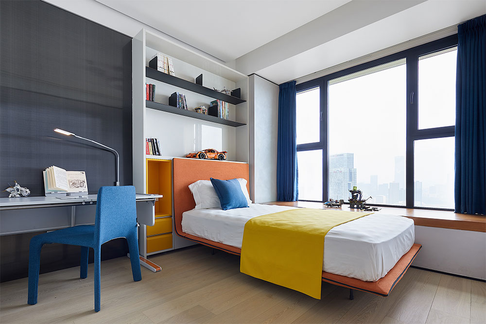 活力橙、明黃與藍(lán)色組塊相互搭配呈現(xiàn),與陳列于各處的汽車、飛機(jī)、機(jī)器人玩具模型,一同點(diǎn)亮孩子趣味盎然、活潑十足的童年時(shí)光。定制的書桌可適時(shí)匹配小男孩的身高,一整面的黑板墻可供小朋友自由繪畫涂鴉,體現(xiàn)著設(shè)計(jì)人性化的考量。