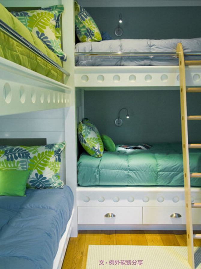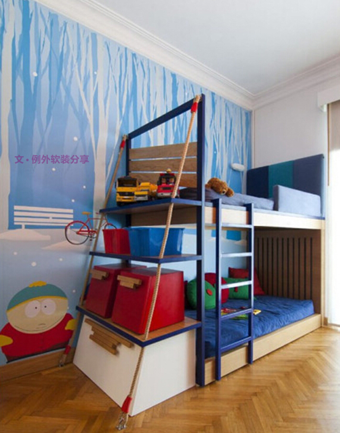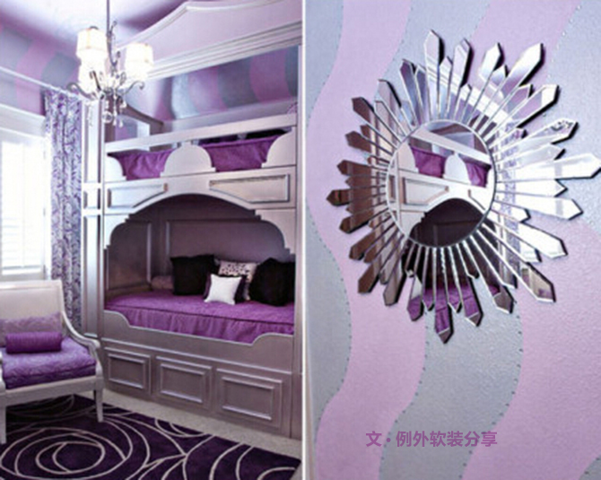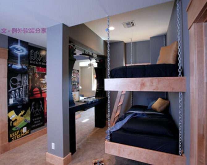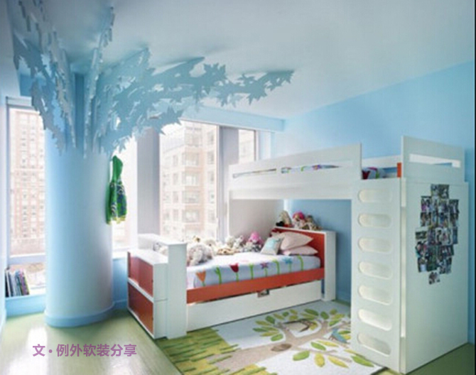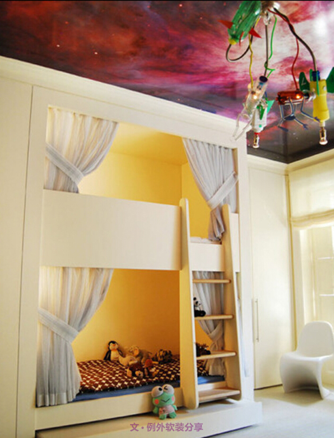款陽光活力的黃橙搭配,幾何圖案構(gòu)成一個充滿現(xiàn)代感的空間,簡潔實用;第二款,原木與藏藍構(gòu)成的空間,尤其適合男孩子,一改常規(guī)的上下鋪設(shè)計,采用鐵鏈吊頂,帶來一股硬朗的工業(yè)氣息,個性十足;第三款清新的天藍色幻化出淡淡的童話味道,尤其是一顆人造樹生動討喜,適合年齡偏小的孩子臥室使用;不少女孩都對紫色情有獨鐘,那么第四款一定會讓你欲罷不能,紫色與銀色交織,尊貴優(yōu)雅氣息十足,配上華麗的枝形吊燈,更加出彩;如果需要打造活潑熱情的感覺,那么這款珊瑚紅的便是首選,利落的幾何線條同樣適合現(xiàn)代風(fēng)格的空間;一眼看來,第六款給人難以言喻的清新,藍綠色的搭配將森林的清新與海洋的爽朗結(jié)合在一起,韻味十足,小編表示特別鐘情這一款;喜歡白色的朋友不妨考慮一下第七款,右上角那盞創(chuàng)意十足的吊燈又為空間帶來幾分別致的韻味;頗具童趣的后一款適合年齡偏小的男孩子,卡通壁紙萌態(tài)十足。