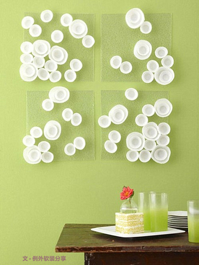 圖一:你能想象只用白紙跟圖釘就能打造出這樣一條“花帶”么,把白紙裁剪成大小不一的圓形充當花瓣,注意邊緣也要剪成鋸齒狀,同時你還可以將白紙適當彎折成適當?shù)幕《?,這樣看起來會更加神似,后再用彩色圖釘將花朵固定,選擇不同的大小錯落排列,這樣一款“花帶”藝術墻就大功告成啦!圖二:還記得你喜歡的CUP CAKE 嗎?將“紙杯”疊放、不規(guī)則排列就做成四幅一組的立體掛畫了。你一定有特別喜歡的彩色卡紙,學習圖4、5那樣包在木板表面,然后進行比例組合,就是一組漂亮的作品啦。當然,像圖6那樣的剪貼畫也是一個簡單的好方法,并且題材選取恰當還能夠充滿故事性及趣味性。
