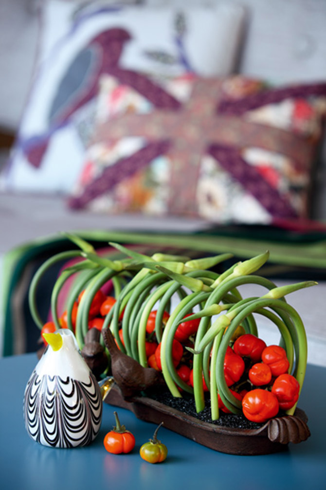 利用蒜薹良好的柔韌性,窩成拱廊狀,再配以火紅的南瓜茄,好似花園深處的一條長廊,并且南瓜茄觀果期長達半年之久,是很好的花藝材料。
