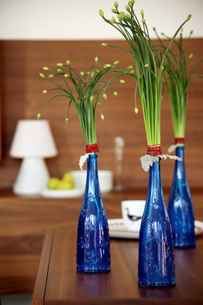 從未想過蒜薹也可以這樣婀娜吧?這就是花藝的魅力。以銀葉菊葉片為輔助花材,將蒜薹用紅水木枝捆扎成型,插入花瓶。如果只是一只花瓶看起來稍顯孤單,不妨三只一起就很有氣氛。蒜薹在制作之前好整體先用水浸泡吸足水分,否則插入后會很容易疲軟,而丟失挺拔之勢。