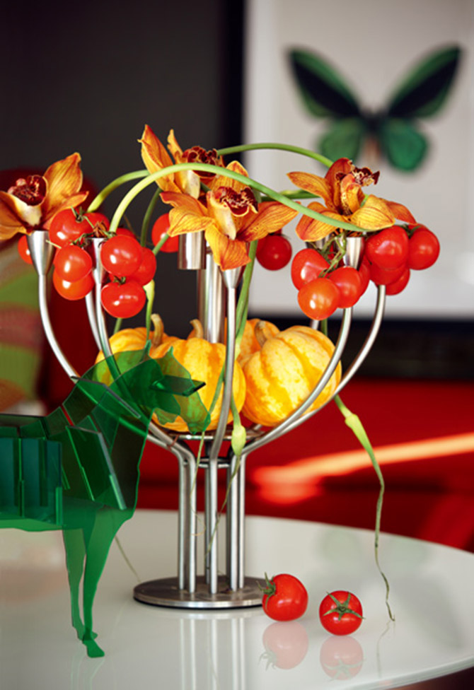 不銹鋼燭臺因為有了暖色調的花材、食材相伴,不再冷清,即使沒有蠟燭,也能感受到如火的熱情。用大花蕙蘭模擬燭光,以櫻桃番茄模擬滴落的燭淚,蒜苗悠然地游走其中,袖珍南瓜壓住陣腳,這樣的熱情,你怎能拒絕得了。