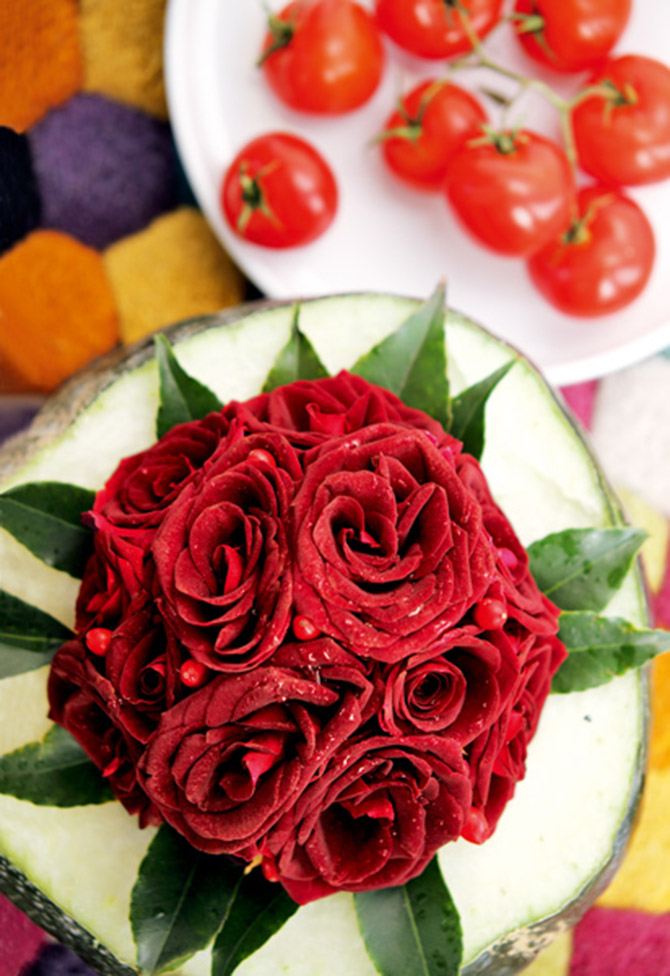 寒冬臘月,室外一派蕭條景象,今天教大家用信手拈來的食材,搭配嬌艷的鮮花來塑造新穎又親切的蔬果插花,讓我們提早感受春天的氛圍。姹紫嫣紅總是春,用取自自然的繽紛色彩來裝點正月里的節(jié)慶,恰逢其時