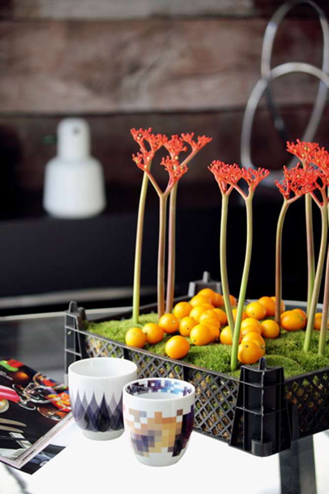 再普通不過的塑料小筐,鋪上蒼翠的青苔后就立刻有了茫茫的草原之態(tài),金橘自由隨意地散落其上,閃爍著金色的光澤,紅色的風輪花花枝纖細修長,這樣的插花擺在桌上富有節(jié)日的氣息。