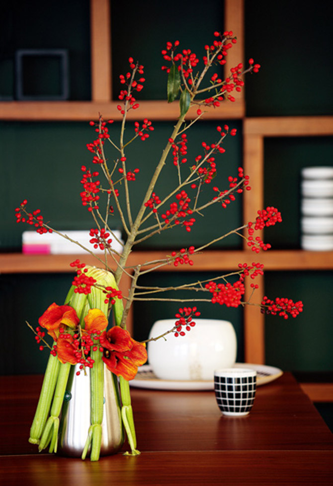 新鮮的西芹打開倒扣在任何一個高度適宜的容器上,就形成了漂亮的傘形,紅花馬蹄蓮可以直接插入西芹的莖稈,折一枝冬青果依偎在側,頗有寫意之風。
