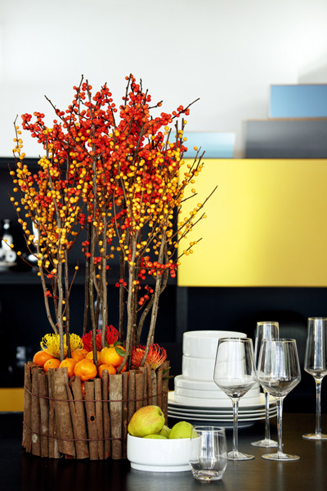 令人驚喜的是秋冬時節(jié)還能剩下這樣色彩奪人注目的果實,非常適合作為插花的花材,果實飽滿圓潤的美麗一點也不輸花朵。這組插花的妙處還在于花器的組裝,用樹皮般粗糙的肉桂棒圍繞而成,質樸無華更映襯出花果的鮮艷。針墊花在這里儼然成了樹林中的灌木叢,這樣的作品擺放在餐桌上讓人食欲大增。
