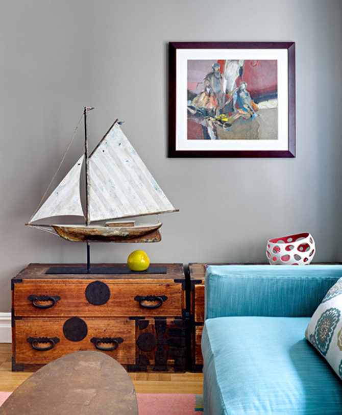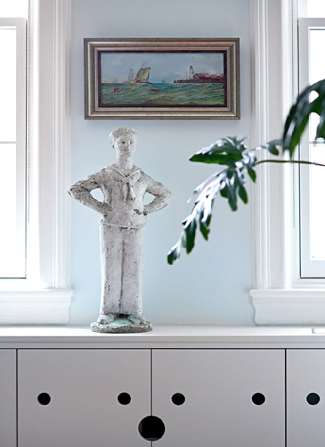 印象派的掛畫,主題是海邊的游泳者;書柜頂上的海鷗擺件,抽屜上的帆船木質(zhì)雕塑,身著海軍服的兒童雕像······于是,你可以清楚地看到,所有的擺設(shè)都能讓你瞬間想到大海。