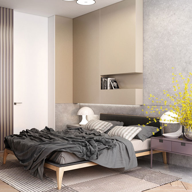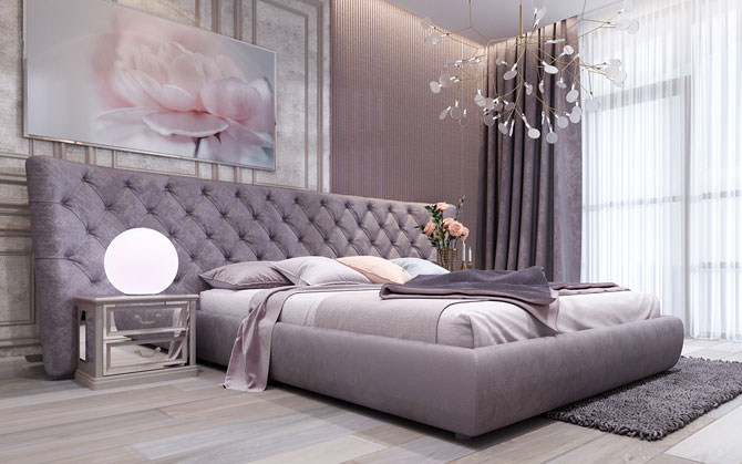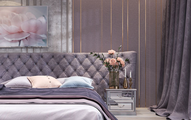 如果將灰紫色用于墻面,與床品更容易形成一個整體,空間感更強。